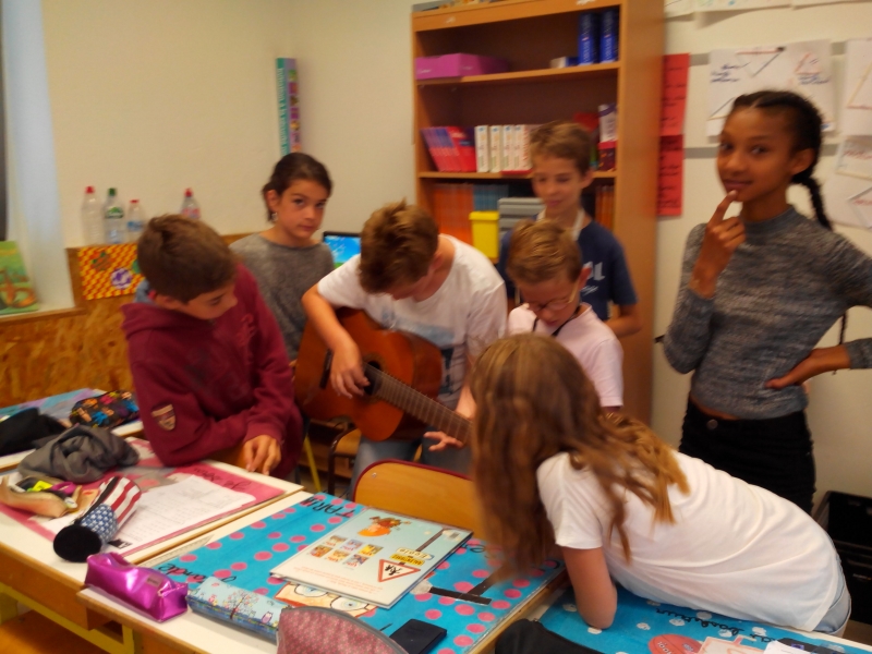 Clément nous a laissé manipuler sa belle guitare après nous avoir joué entre autres Tri Martolod.