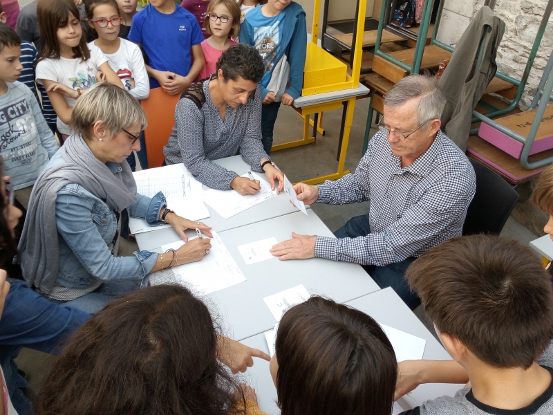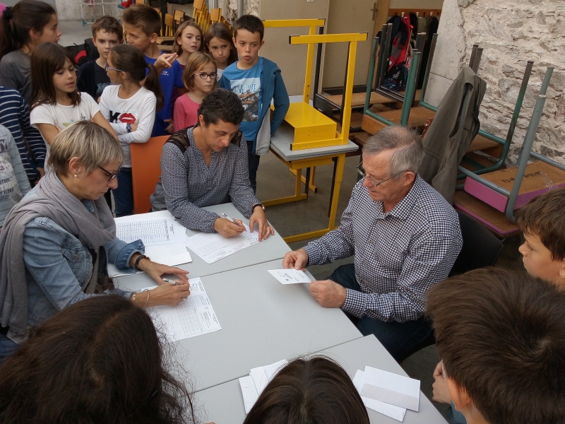 Vendredi 12 octobre 2018. Les conseillers municipaux sont venus en début d’après-midi effectuer le dépouillement : les enfants ont participé en ouvrant les enveloppes. Puis à 15h, nous nous sommes rendus à la salle Arc-en-ciel pour la proclamation des résultats en présence de l’école Alexandre Bernard.