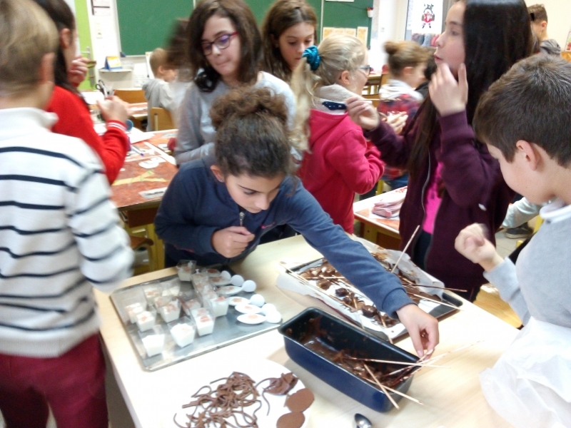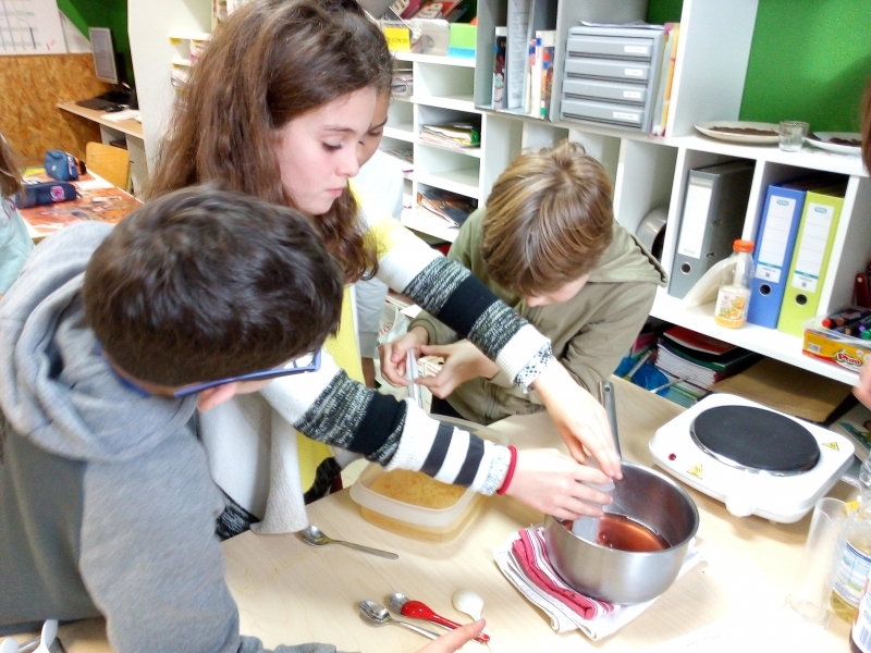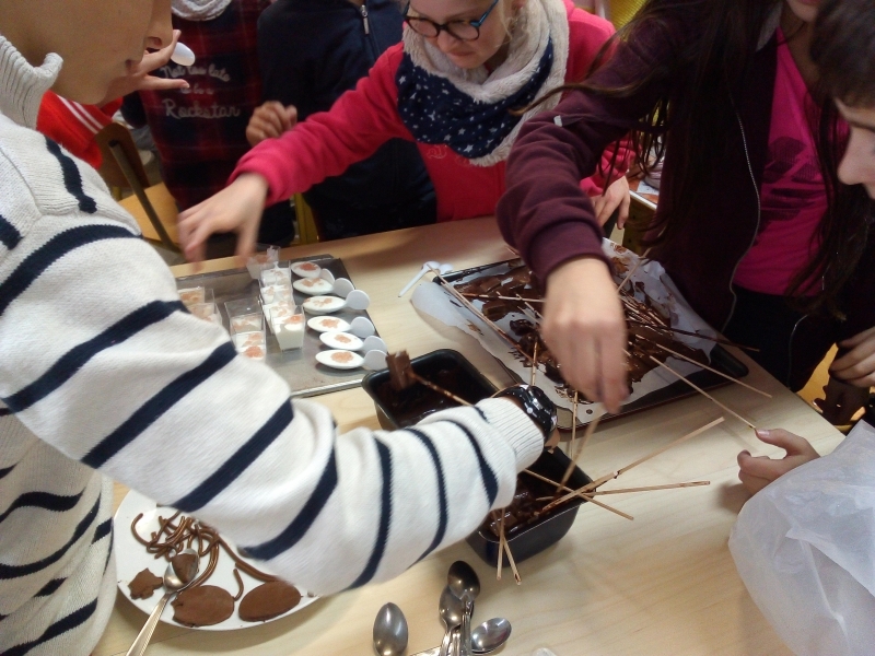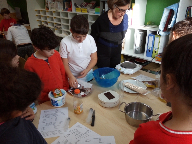 Lundi 17 décembre. Suite à notre chapitre en sciences sur les mélanges et solutions, nous avons testé 3 recettes lors d’un atelier cuisine moléculaire : dés de fruits au chocolat, spaghettis chocolat et caviar de fraises sur fromage blanc. Tout le monde s’est beaucoup amusé et chacun s’est régalé lors de la dégustation !